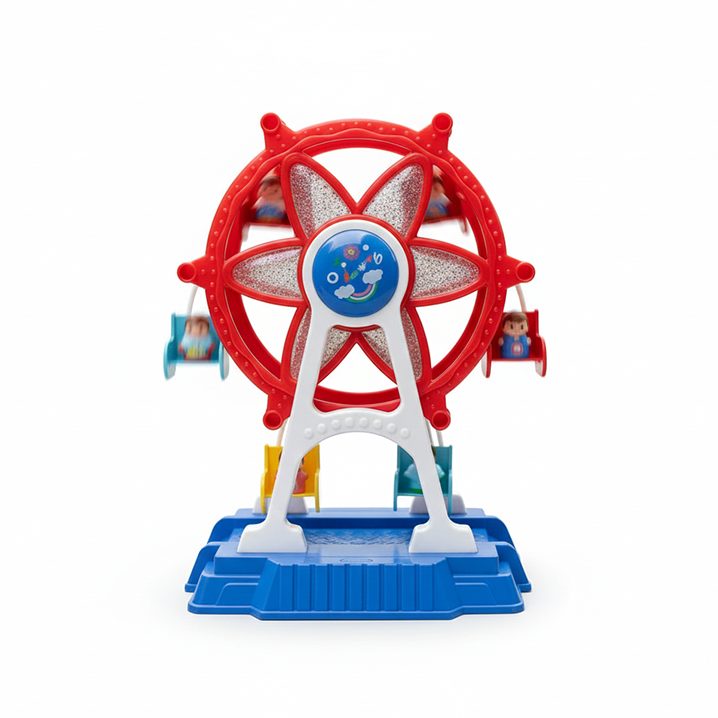 Musical Light-Up Rotating Ferris Wheel Toy (Model 2BS13) brings the amusement park experience home. Manufactured by R&R, this toy features bright colors, cheerful music, flashing LED lights, and a smooth 360-degree rotation mechanism. Designed for children aged 3+, it encourages imaginative storytelling and sensory development by simulating the excitement of a real carnival ride.