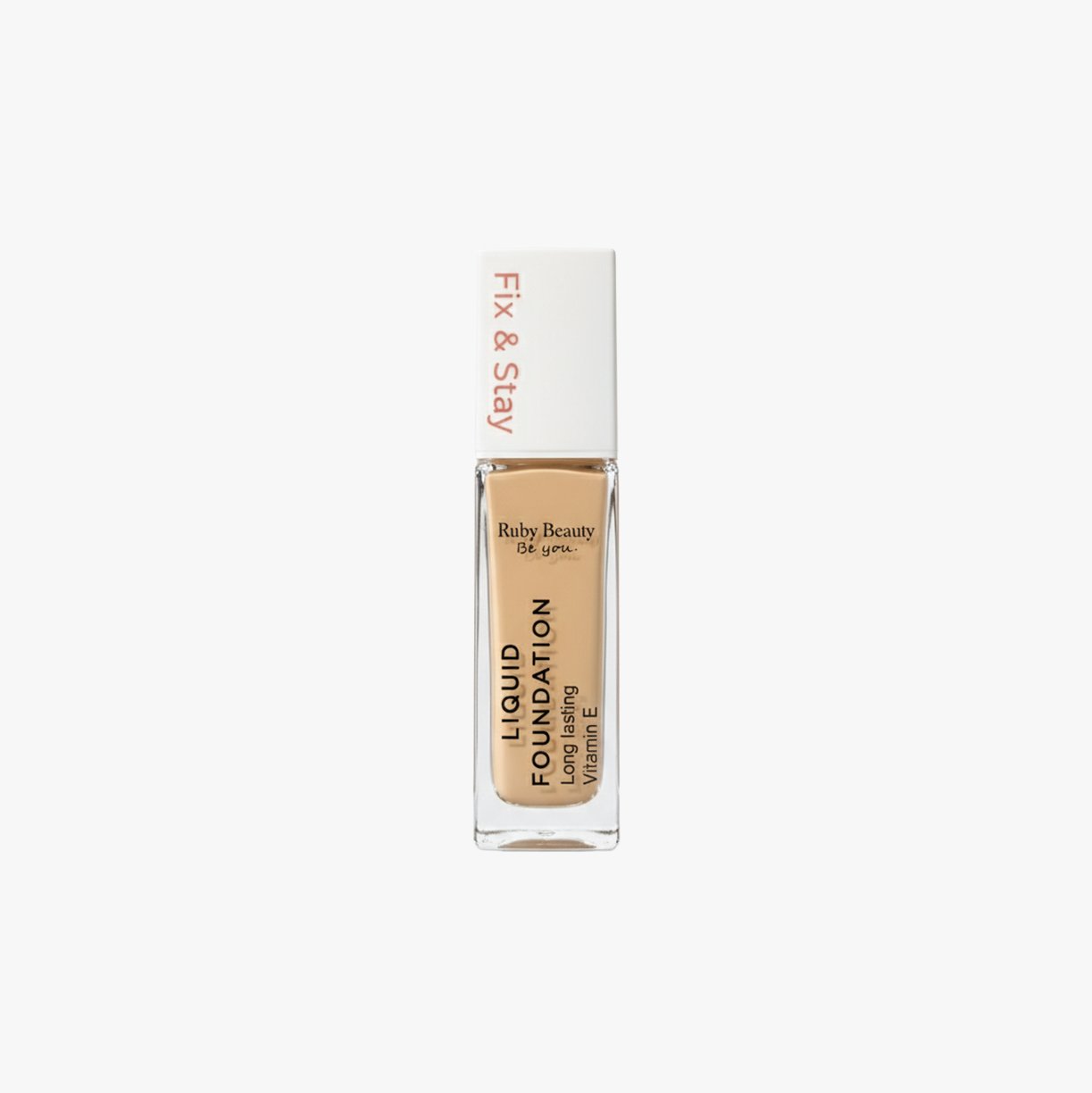 Ruby Beauty Fix & Stay Liquid Foundation is a long-lasting, lightweight foundation enriched with Vitamin E for a flawless, hydrated, and radiant complexion.