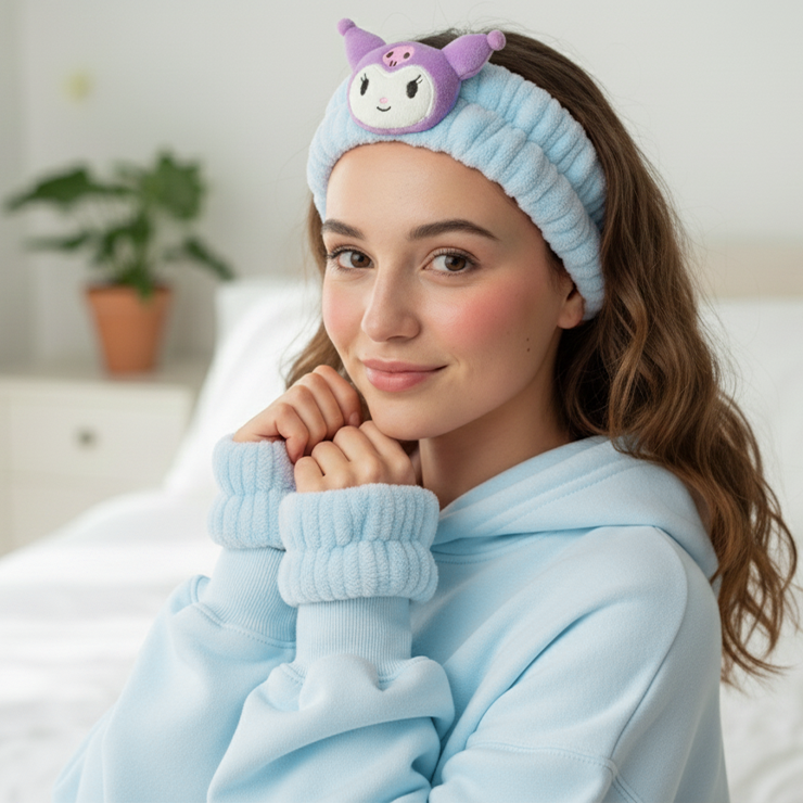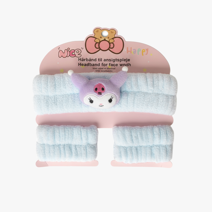 Sanrio Kuromi Plush Spa Headband and Wristbands Set is a charming and practical three-piece accessory kit designed to enhance any beauty or skincare routine. The set features a soft, absorbent, and stretchy light blue terry cloth headband adorned with a plush 3D applique of the mischievous Sanrio character, Kuromi. The matching pair of wristbands are also made from the same soft material, and their primary function is to prevent water from dripping down the arms and wetting sleeves or the floor while washing the face, applying masks, or doing makeup. This set is a delightful gift for fans of the Kuromi character and the Kawaii aesthetic.