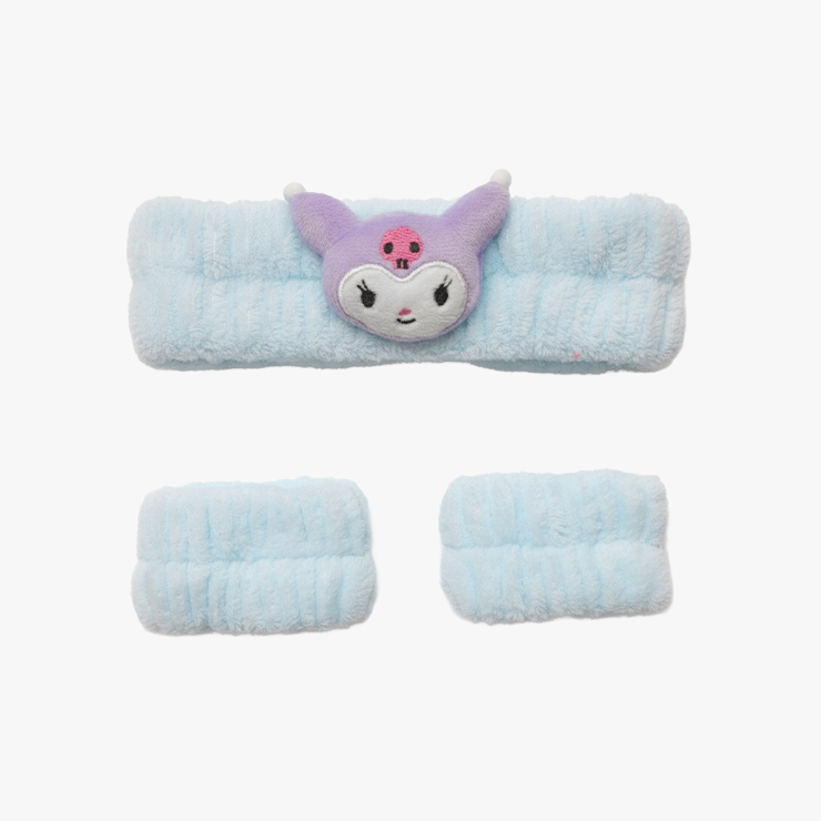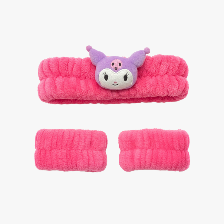 Sanrio Kuromi Plush Spa Headband and Wristbands Set includes an absorbent terry cloth headband with a Kuromi plush and two matching wristbands to keep hair and sleeves dry during skincare routines.