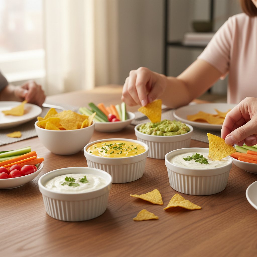 Fluted Ceramic Ramekin Set of five white ramekins, perfect for individual servings, dips, or baking, presented on a convenient serving tray with red pull-tabs.