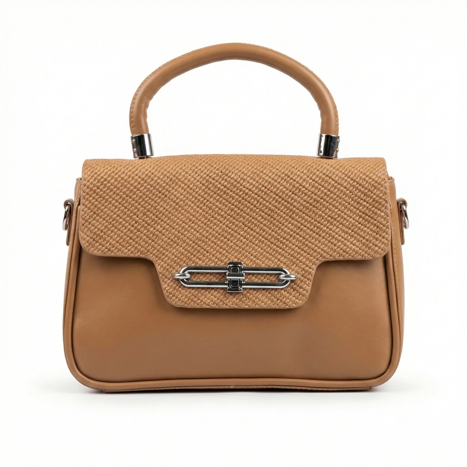 snakeskin textured handbag featuring a sophisticated dual-texture design. The body is crafted from smooth, high-quality synthetic leather, while the front flap showcases an exotic embossed snakeskin pattern. It is accented with a unique silver-toned chain-link sliding clasp and a sturdy circular top handle. The interior is spacious enough for daily essentials, and it typically includes a detachable shoulder strap for versatility.