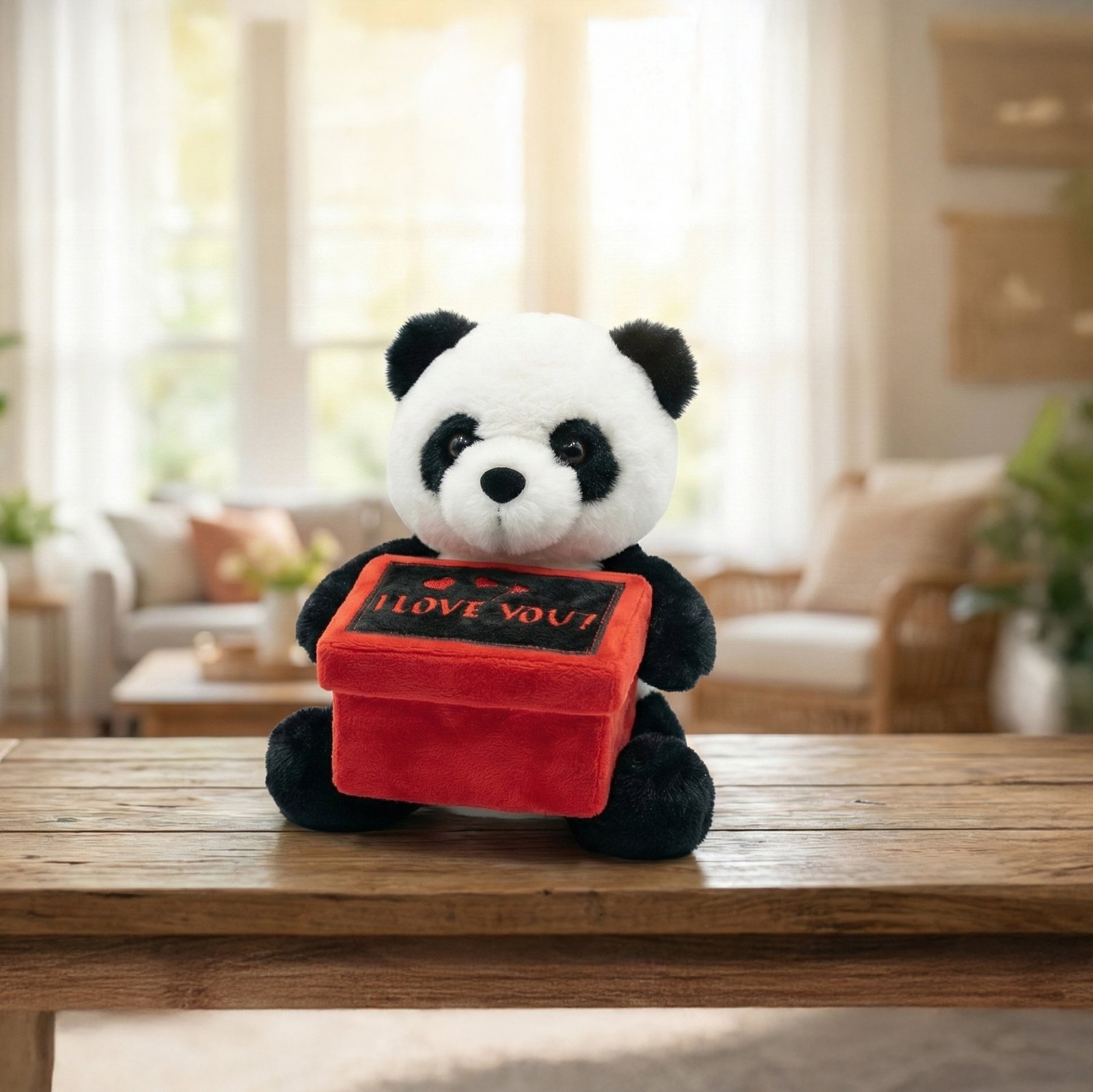 Soft Things Panda Holding Love Box is a soft plush panda holding a red heart-themed box with a sentimental message, perfect for romantic gifting.