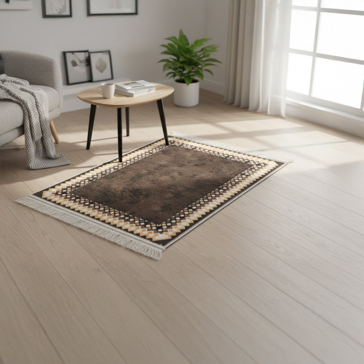 Southwestern geometric border brown area rugs feature a solid dark mocha or chocolate brown field framed by a intricate tribal border. The border typically consists of repeating diamond or “stepped” geometric motifs in ochre, cream, and charcoal tones. Often finished with a soft white fringe, these rugs are usually power-loomed from durable, low-shed synthetic fibers like polypropylene, making them ideal for high-traffic living rooms or entryways.