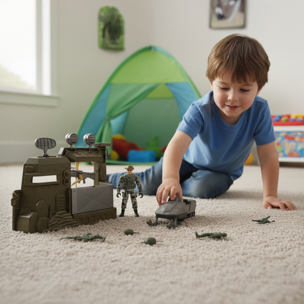 special Forces Military Model playset designed for action-packed imaginative play. This “Special Rescue Team” set includes a fully articulated soldier action figure equipped for combat. The box features a defensive bunker wall section with a mounted heavy machine gun, sandbags, and a tactical river raft/boat with attached weaponry. Perfect for kids who enjoy creating military scenarios.