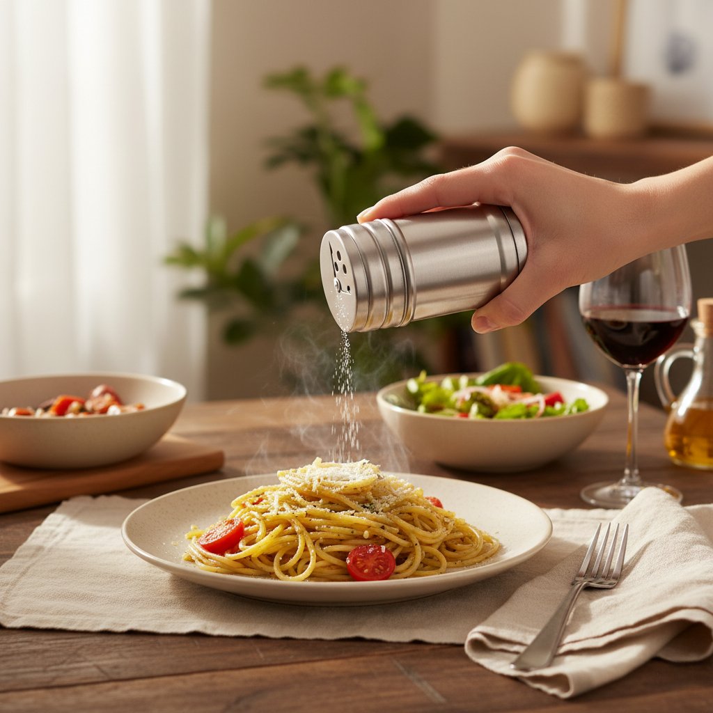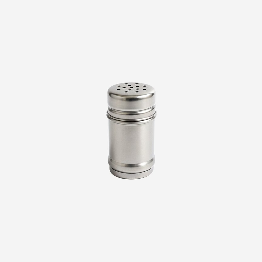 Stainless Steel Spice Shaker is a durable, commercial-style dredge with an adjustable, rotating lid, perfect for dispensing fine powders like spices or sugar.