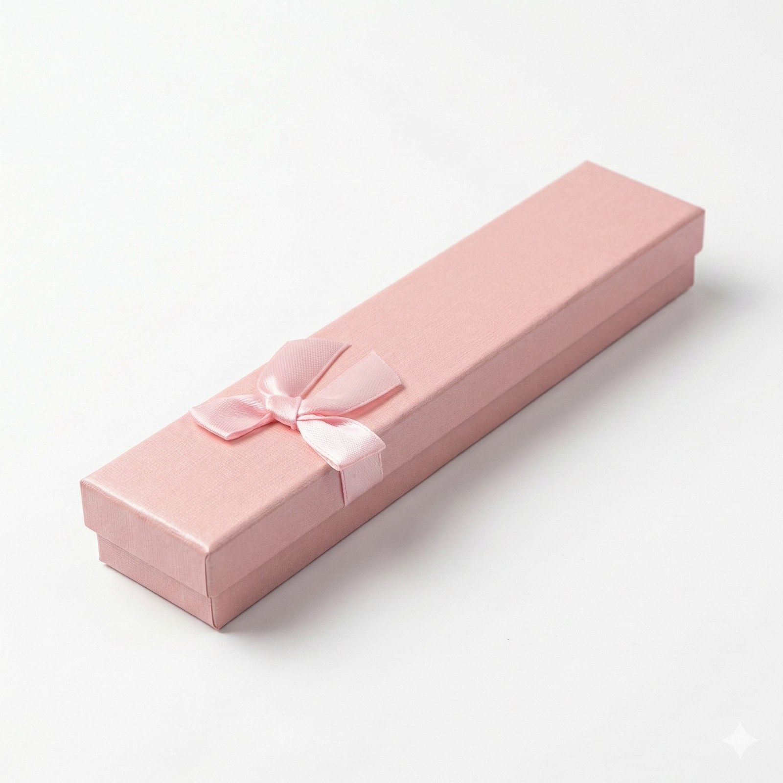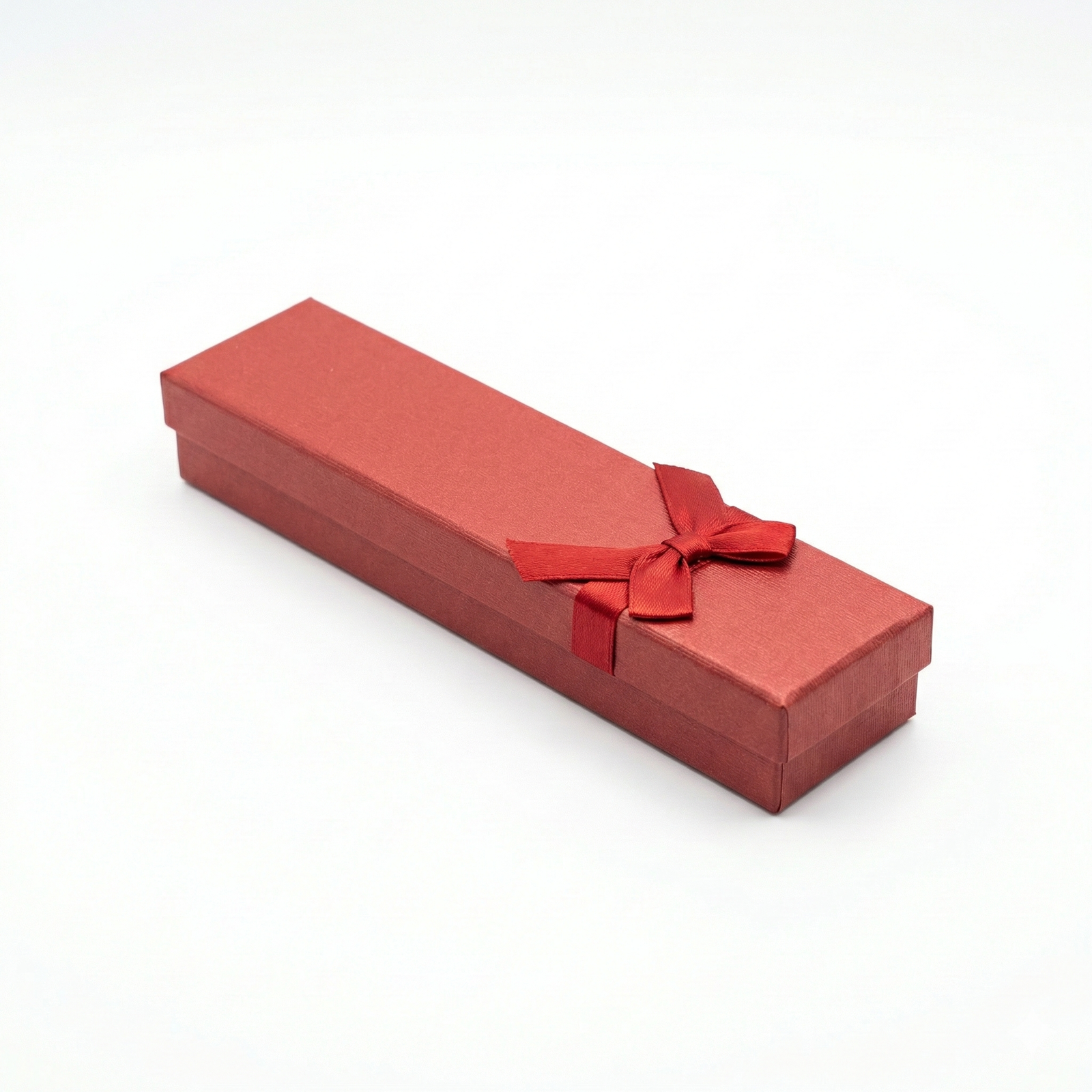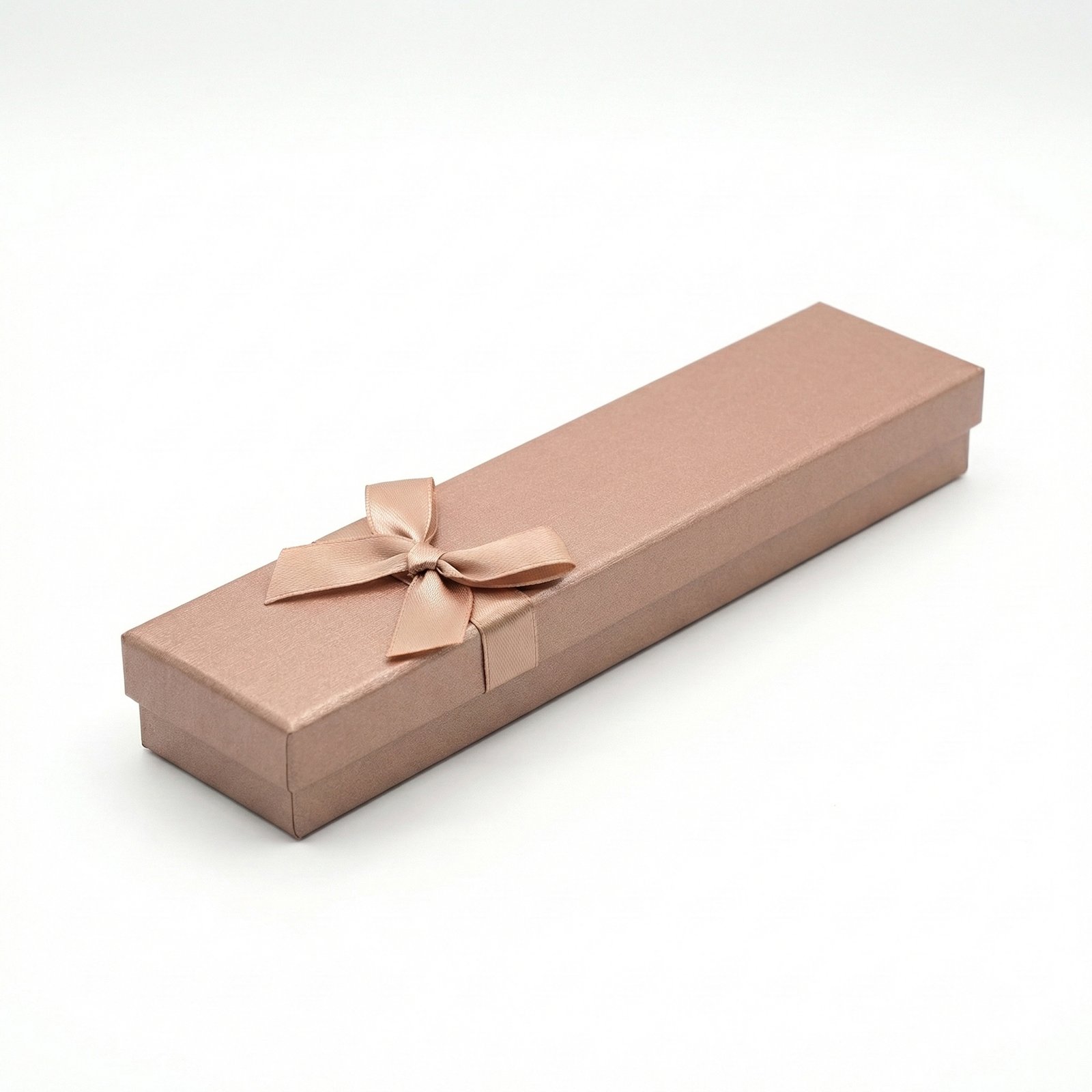 Textured long jewelry box featuring a rigid paperboard construction and an embossed linen-style finish. Designed with a pre-applied decorative satin ribbon bow, this box is specifically sized for necklaces, watches, and bracelets. The interior contains a soft, tarnish-resistant cotton or foam insert to protect delicate surfaces from scratches during transit..