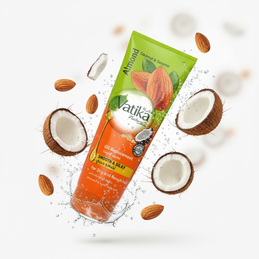 Vatika Smooth & Silky Oil Replacement is enriched with natural extracts of almond, coconut, and sesame. This non-sticky, light, and easy-to-absorb formula is designed for dry and coarse hair. It nourishes, replenishes lost oils, and leaves hair silky, smooth, and manageable without a greasy texture.