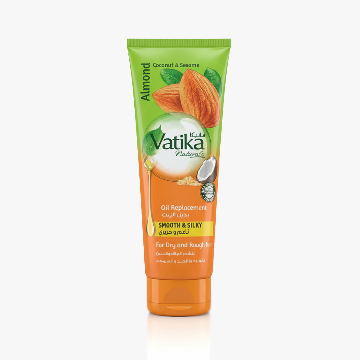 Vatika Smooth & Silky Oil Replacement nourishes dry, rough hair with almond, coconut, and sesame to make it soft and manageable.