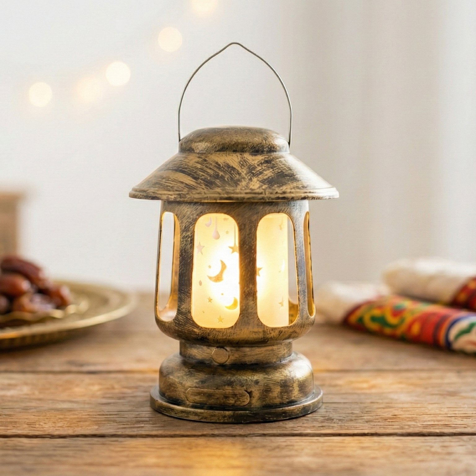 Vintage Bronze Star and Moon Decorative Lantern is a portable, battery-operated lighting fixture designed with a classic antique finish. The lantern features an intricate star and moon pattern cut into a frosted inner cylinder, which casts a celestial glow when the internal LED is activated. Built from durable ABS plastic with a metallic bronze brush effect, it includes a sturdy wire handle for hanging or carrying. It is ideal for festive celebrations like Ramadan and Eid, or as a cozy nightlight for bedrooms and patios.