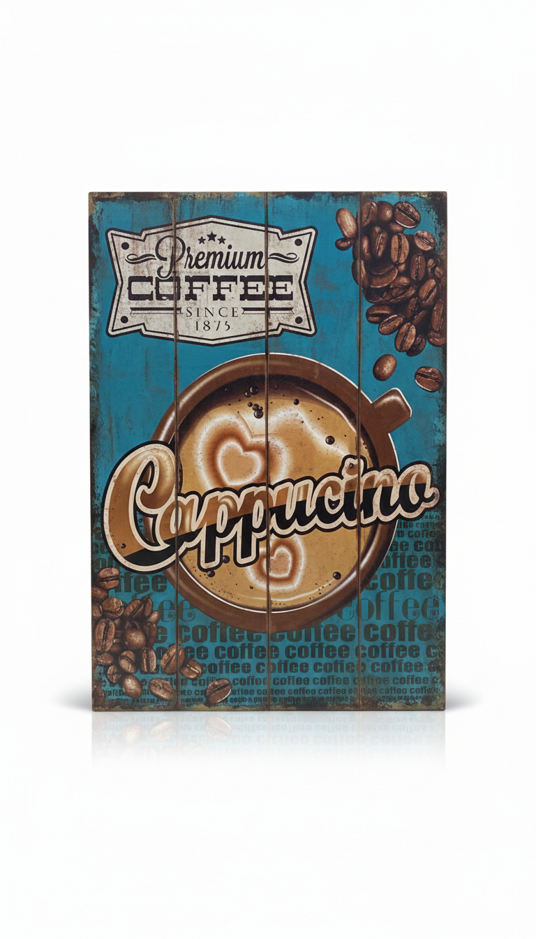 Premium Coffee Since 1875 decorative wooden plaque showcasing a high-definition cappuccino cup with heart-shaped latte art against a teal wood-panel background. This vertical wall art is crafted from sturdy wood particle board or MDF, designed to evoke a nostalgic “old world” coffee shop atmosphere. Ideal for home coffee bars, kitchens, or professional bistros.
