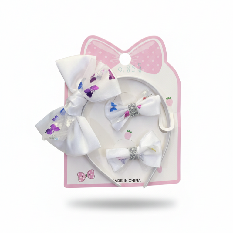 White Butterfly Bow Headband and Hair Clip Set is a cute 3-piece accessory kit for girls featuring butterfly-print satin bows and glitter accents.
