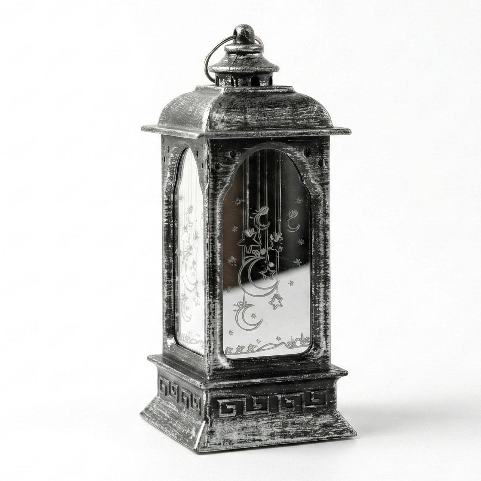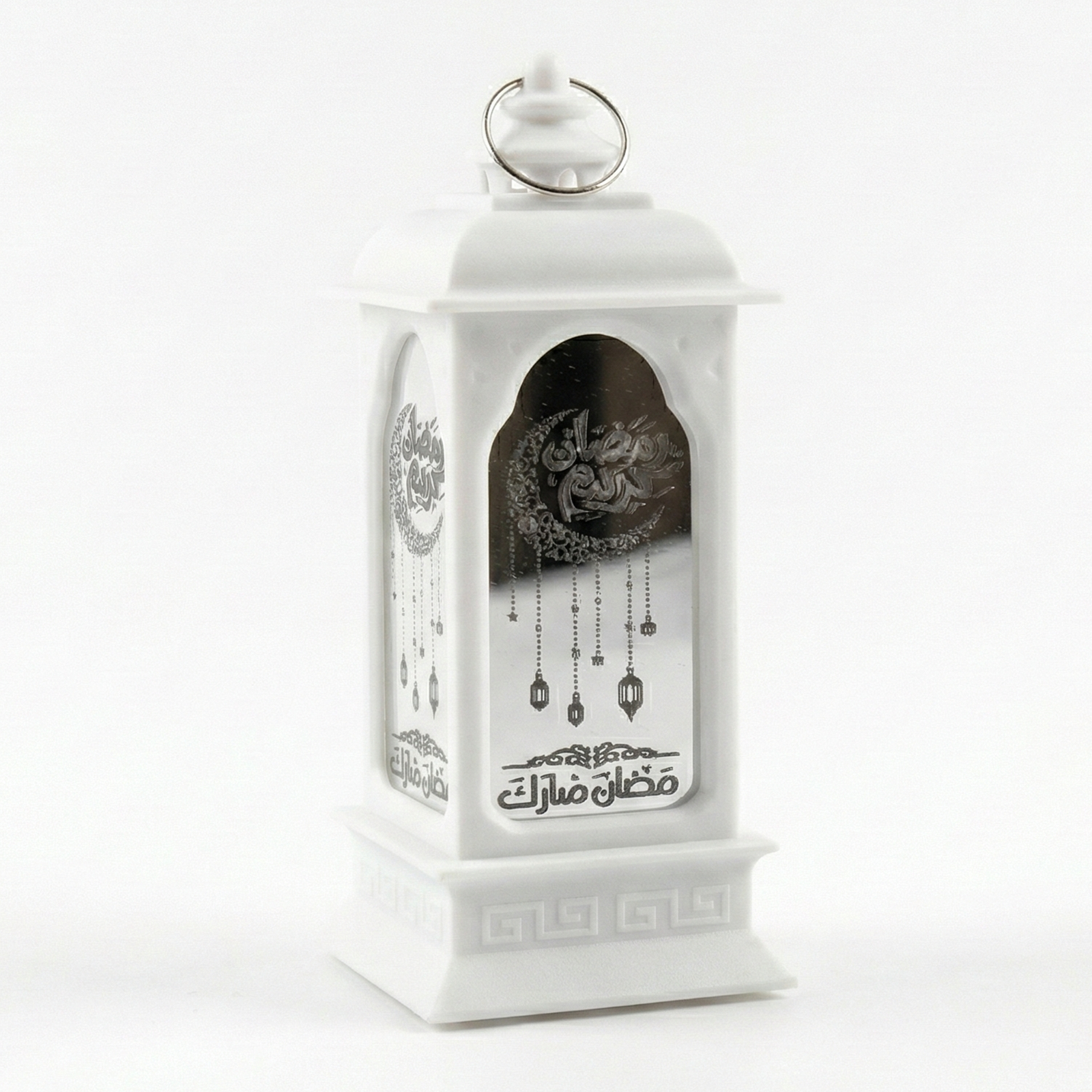 White LED Ramadan Mubarak Lantern is a beautiful, battery-operated decorative lamp featuring mirrored glass panels and elegant Arabic calligraphy to create a warm festive glow.
